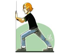 Encoste a ponta do pé esquerdo na parede, flexione o joelho e mantenha a outra perna atrás esticada, totalmente estendida e sem levantar o calcanhar. Apóie as mãos na parede. Quanto mais próximo da parede estiver o joelho flexionado, mais será alongada a perna de trás. Mantenha por 20 segundos e faça com a outra perna.